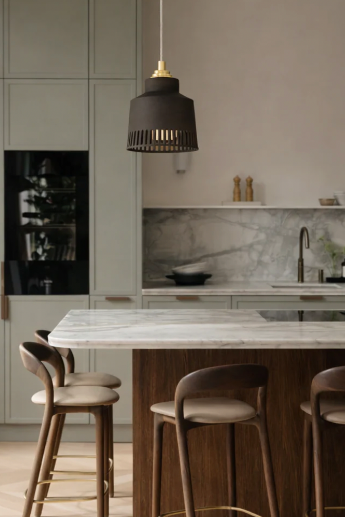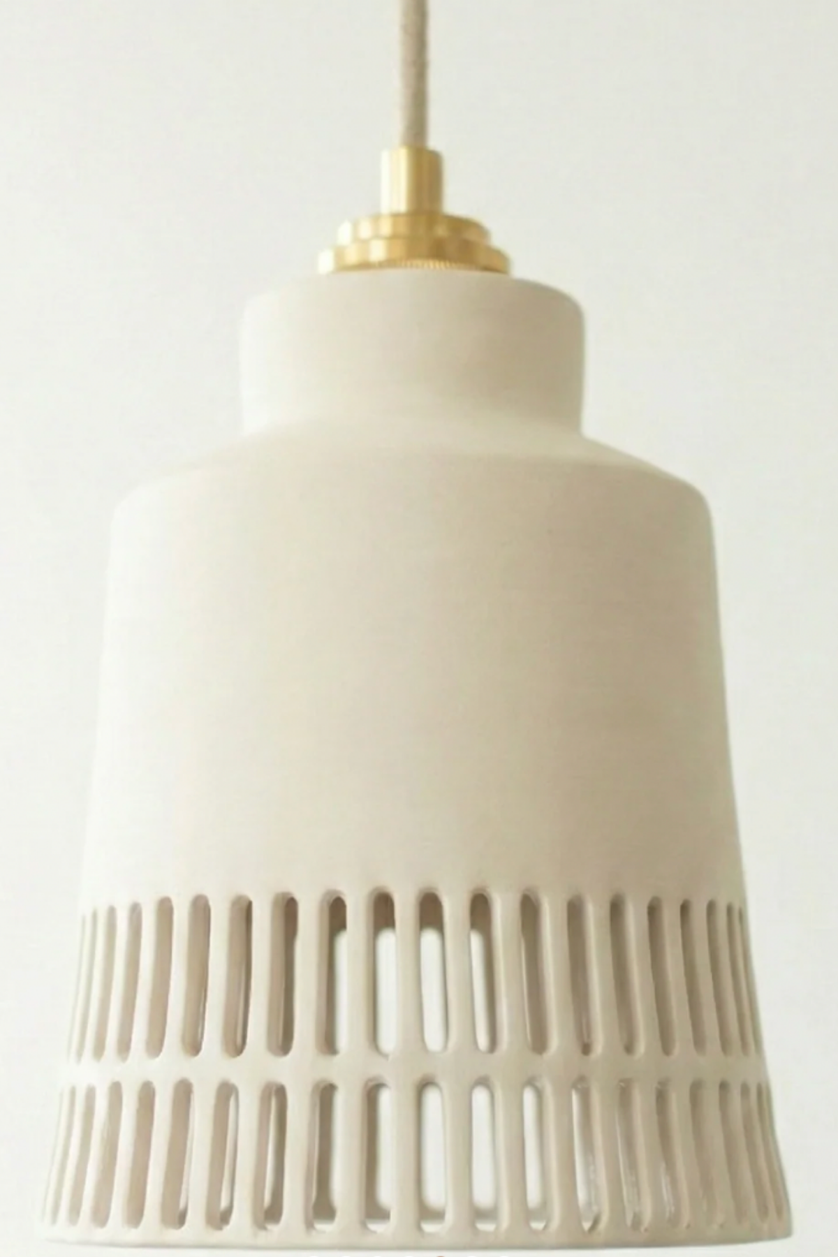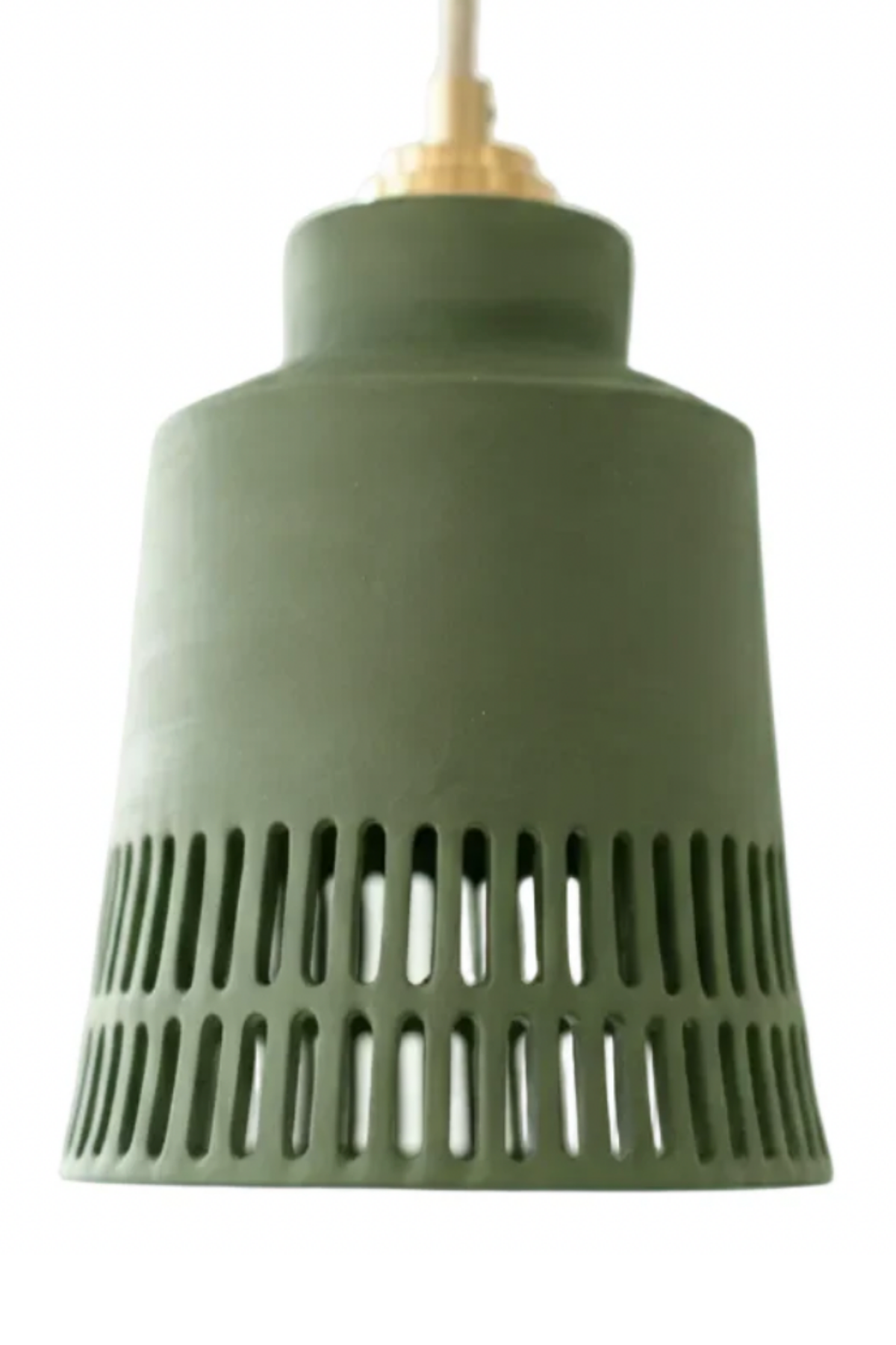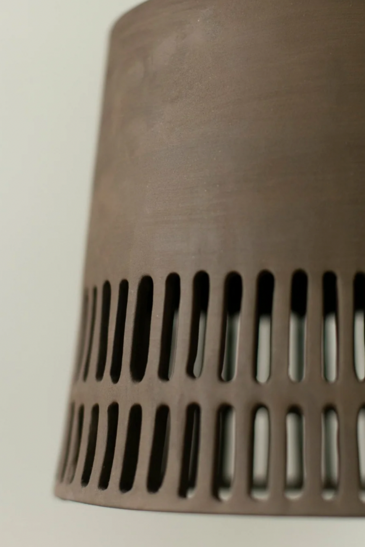 A sophisticated blend of raw texture and precise geometry. Handmade in Spain, the Helecho pendant light features a deep, natural clay body accented by polished brass hardware.