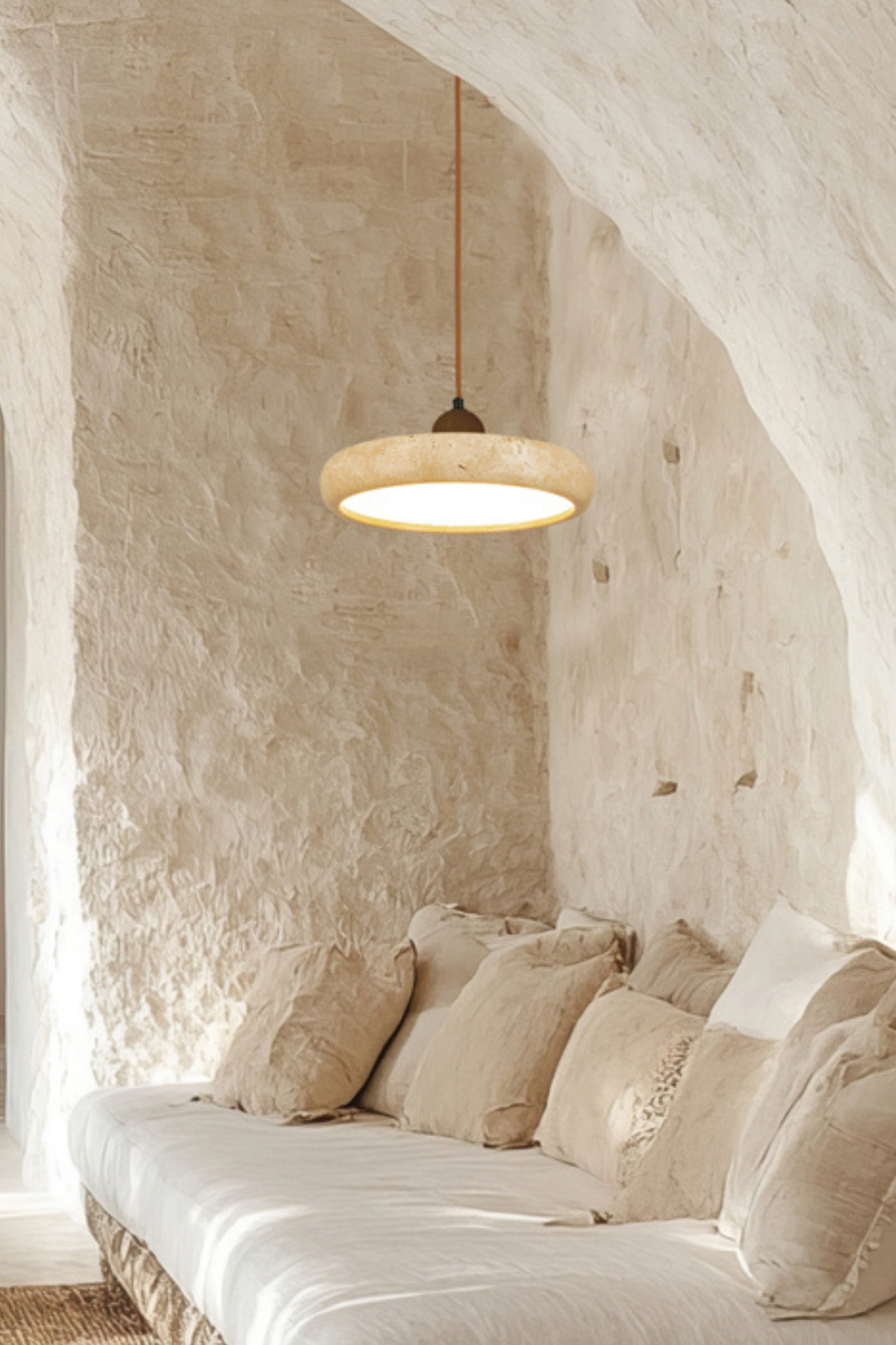 The Petra Pendant celebrates the raw beauty of travertine, paired with a soft diffused glow and decorative wood element. Its sculpted, low-profile form adds warm, natural elegance to dining, living and relaxed Mediterranean-inspired interiors.