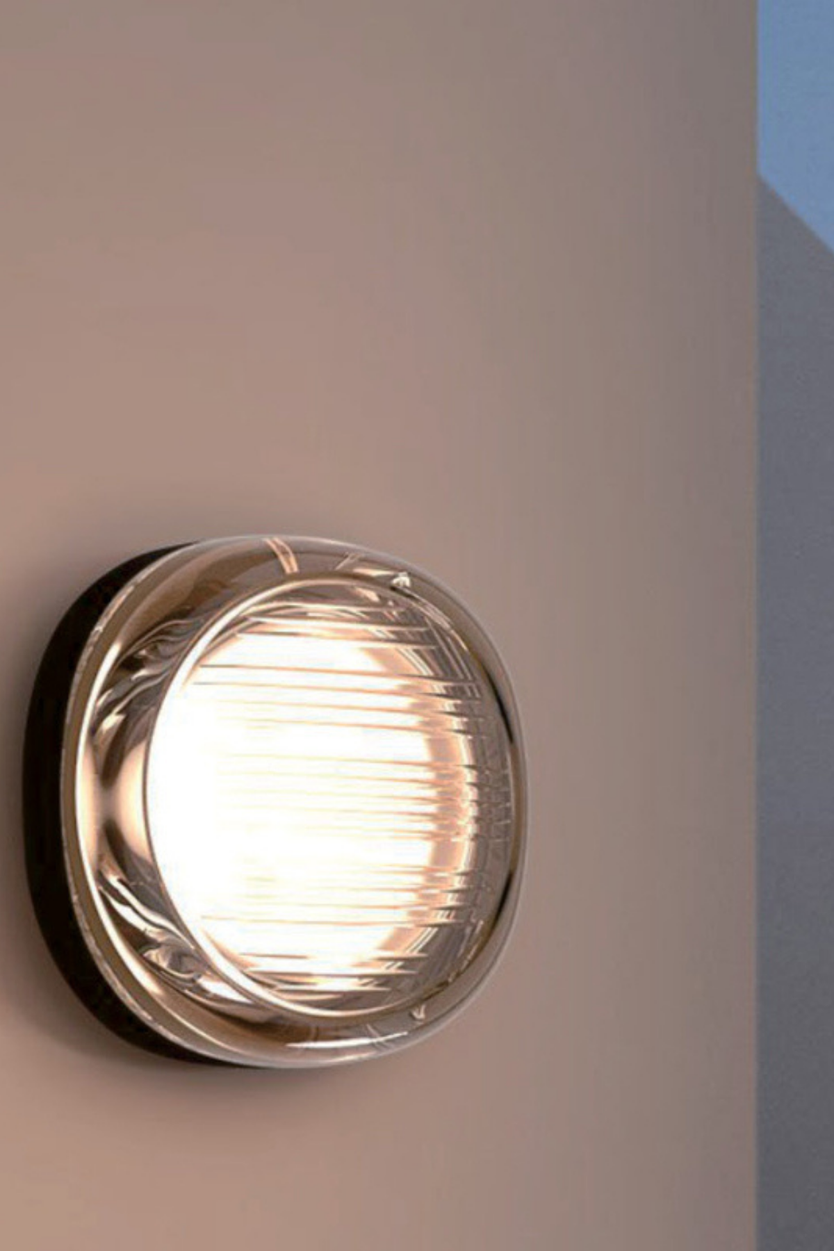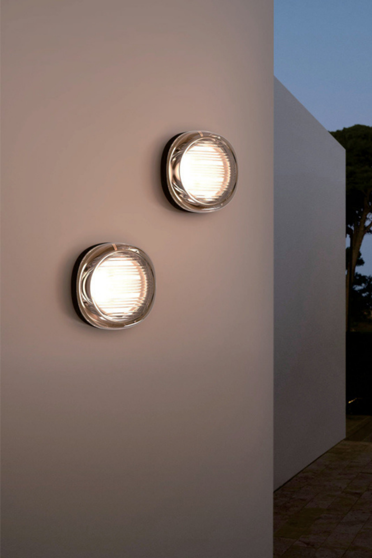 Compact and IP65-rated, the Ilios wall light features a refined, nautical-inspired design. Its ribbed glass diffuser and sleek metal frame cast warm, functional illumination, perfect for exterior spaces. Available in clear, champagne, and green finishes.